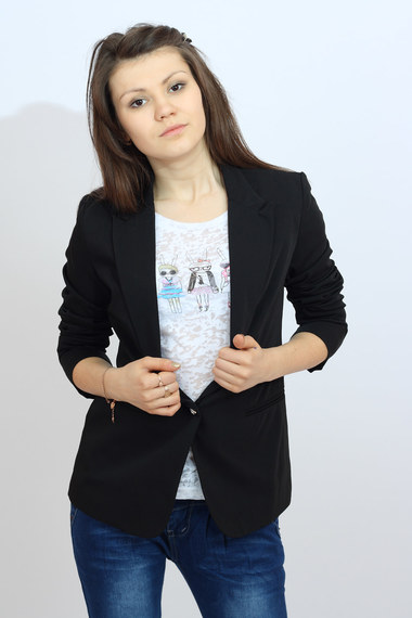 Элегантный жакет черного цвета с длинными рукавами - идеальный вариант для офисных будней! Модель классического кроя, с застежкой на одну пуговицу и рукавами длиной 3/4.